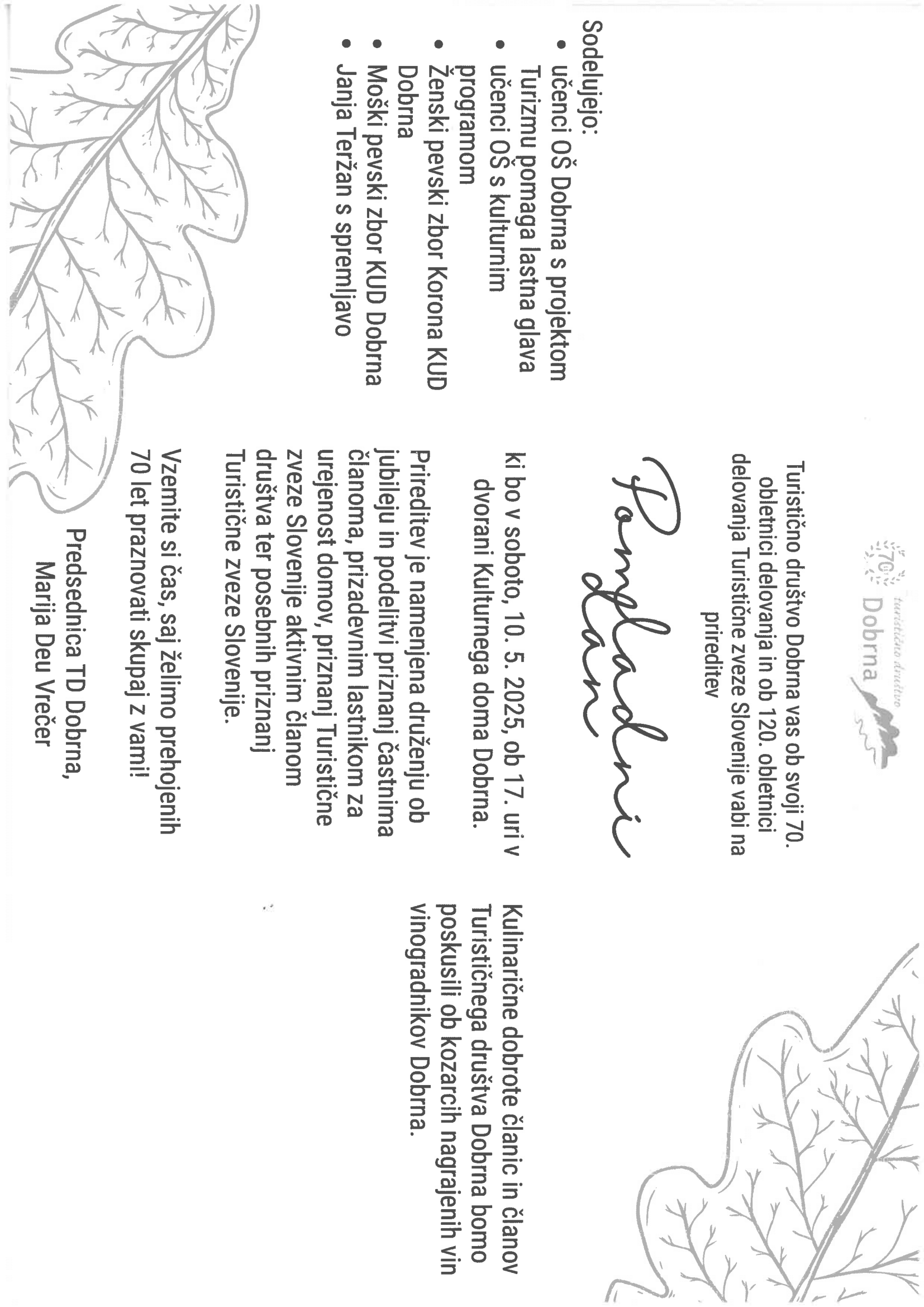 TD Dobrna praznuje 70 let delovanja. ČESTITKE! 0.0 Zadnja posodobitev: -/- Sorodne Novice: Dobrna - čistilna akcija 2025 Valentinov koncert - Dobrna 2025 Dobrna - gozdna terapija in gong Dobrna - ocenjevanje salam Dobrna - čistilna akcija Dobrna - Velikonočne delavnice VALENTINOV KONCERT - DOBRNA 2024 Pustna nedelja Dobrna 2024 Pustno rajanje Dobrna 2024 Blagoslov vina - Dobrna 0 Dobrna