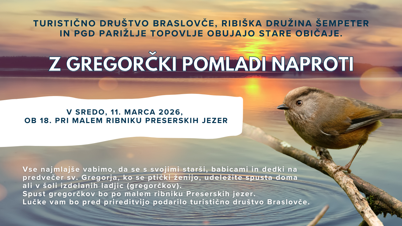 Gregorjevo v Braslovčah 0.0 Zadnja posodobitev: torek 10 marec 2026 09:09 Sorodne Novice: Pomlad na Grilovi domačiji 2026 Braslovče - salamijada 2026 SKUPŠČINA RTZ SAŠKA 2026 SEJEM ALPE ADRIA 2026 Valentinovo 2026 na Dobrni POHOD NA RAMŠAKOV VRH 2026 VALENTINOV POHOD 2026 V DOBRINI OBČNI ZBOR TD VINSKA GORA 2026 SREČNO 2026 TD Braslovče - beremo v gozdni knjižnici 0 Gregorjevo