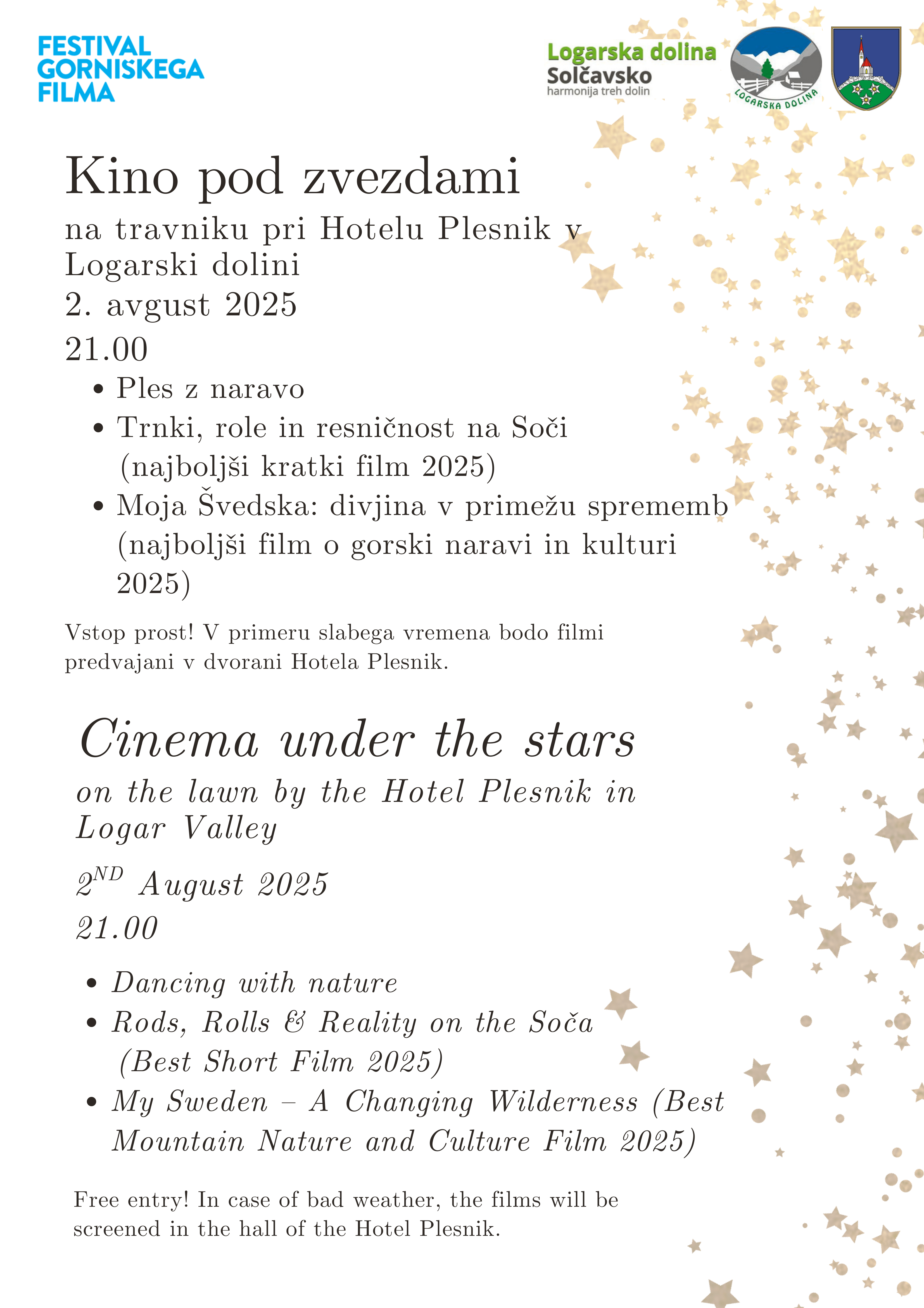 Vabljeni v kino pod zvezdami v Logarsko Dolino 0.0 Zadnja posodobitev: -/- Sorodne Novice: Koncert v Logarski dolini Šege in navade v Šaleški dolini Festival zelišč v z. sav. dolini 0 Kino
